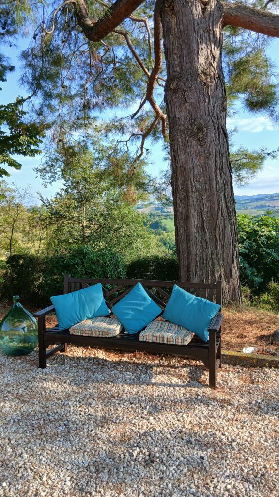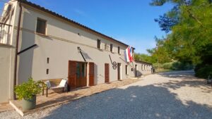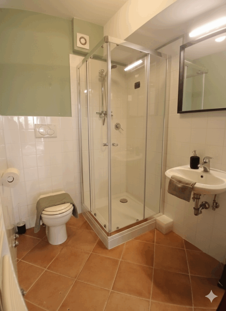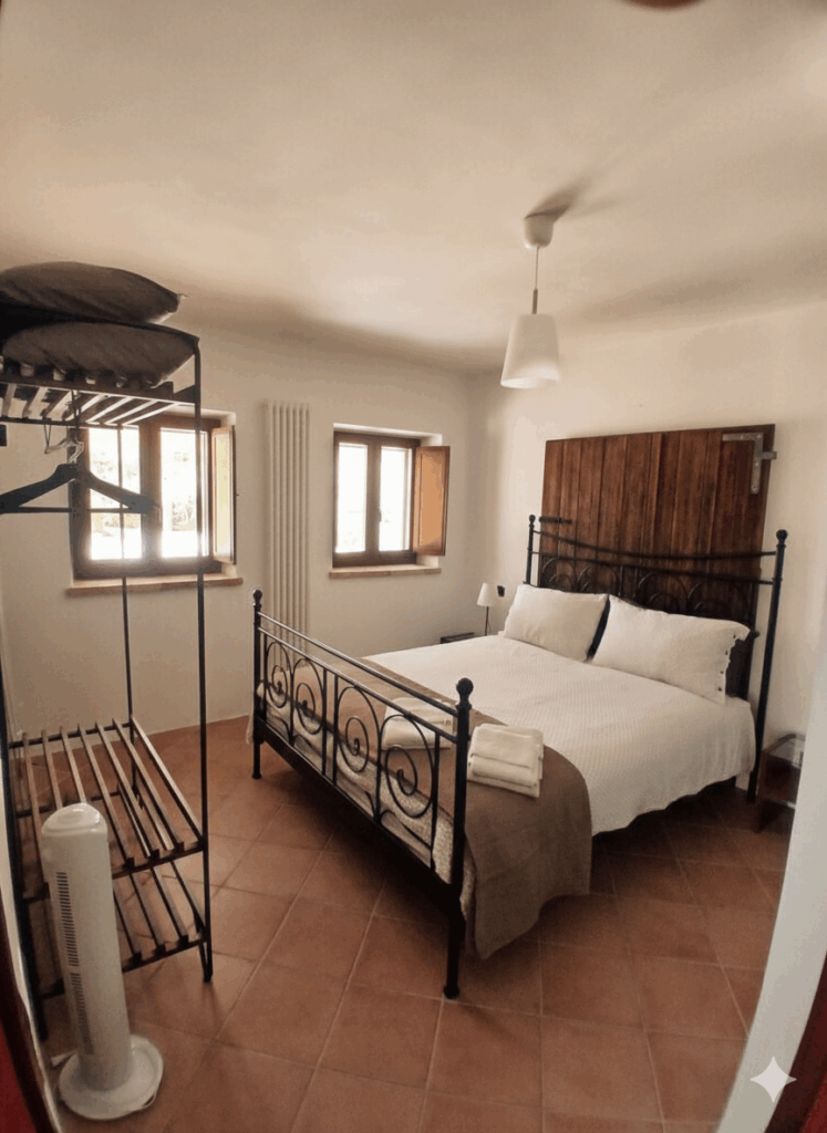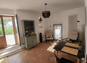 On the ground floor we have a nice apartment for 2 people. The apartment is fully equipped for a pleasant stay. The kitchenette has a small fridge-freezer, toaster, coffee/tea machine a kettle and an electric stove . The bedroom has a double bed with a pillow for everyone. The bathroom has a shower, toilet and washbasin with hairdryer, toilet paper is provided. Shower towels and kitchen towels are changed every 4 days, bed linen is changed once for stays of 9 days or longer.  A fan provides the necessary cooling. Door and windows are equipped with mosquito nets. The name of the flat is Monte Giberto, named after the village where we live.